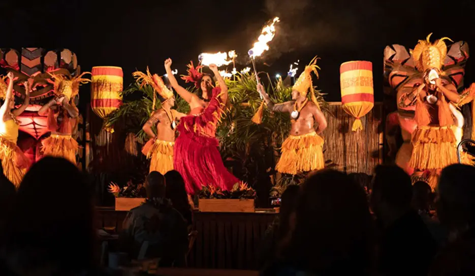 The meal is accompanied by live Hawaiian music, hula dancing performances and even fire knife dancers lighting up the night sky as they twirl their blades through the air.